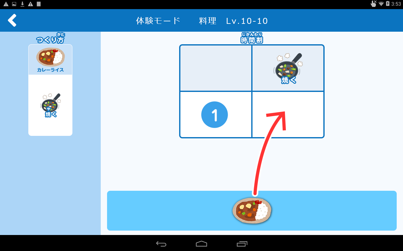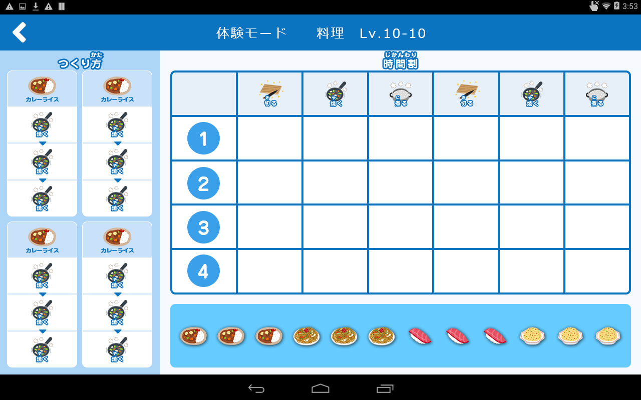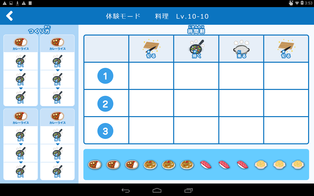 りょうり 調理器具を遊ばせず、だんどりよくお料理しよう! ルールは簡単、左の作り方を確認して、時間割の調理器具に料理をドラッグしよう カレーライスとやきそば、フライパンを使う時間がかぶらないようにするには? どんどん難しくなってくるよ。(画面は開発中のものです) 手際よくやっていこう!(画面は開発中のものです) のりかえ | りょうり | そうじ 「プログラミング先生」を体験したい 「お試し版」近日公開 「プログラミング先生」をもっと知りたい よくあるご質問 お問い合わせ
